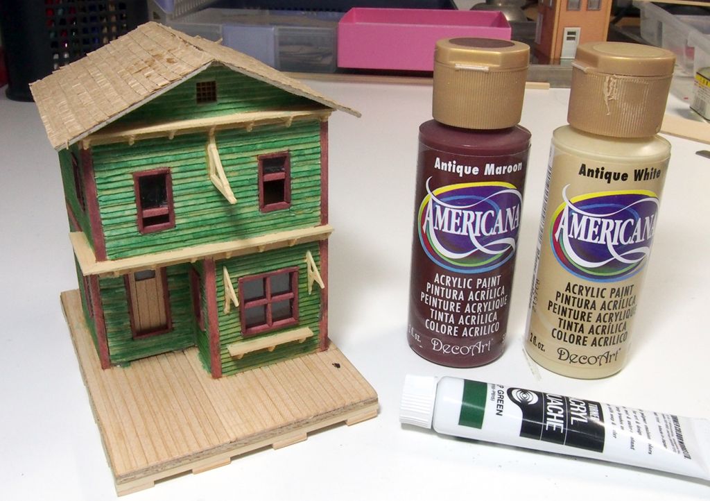 壁に絵具を塗る. 他はAMERICANAという水性アクリル塗料を使っている. 壁面の突起物は、 看板や幌を取付ける器具(プラ製). 裏口の階段を作って、 屋根を塗装. だいぶ家らしくなった.