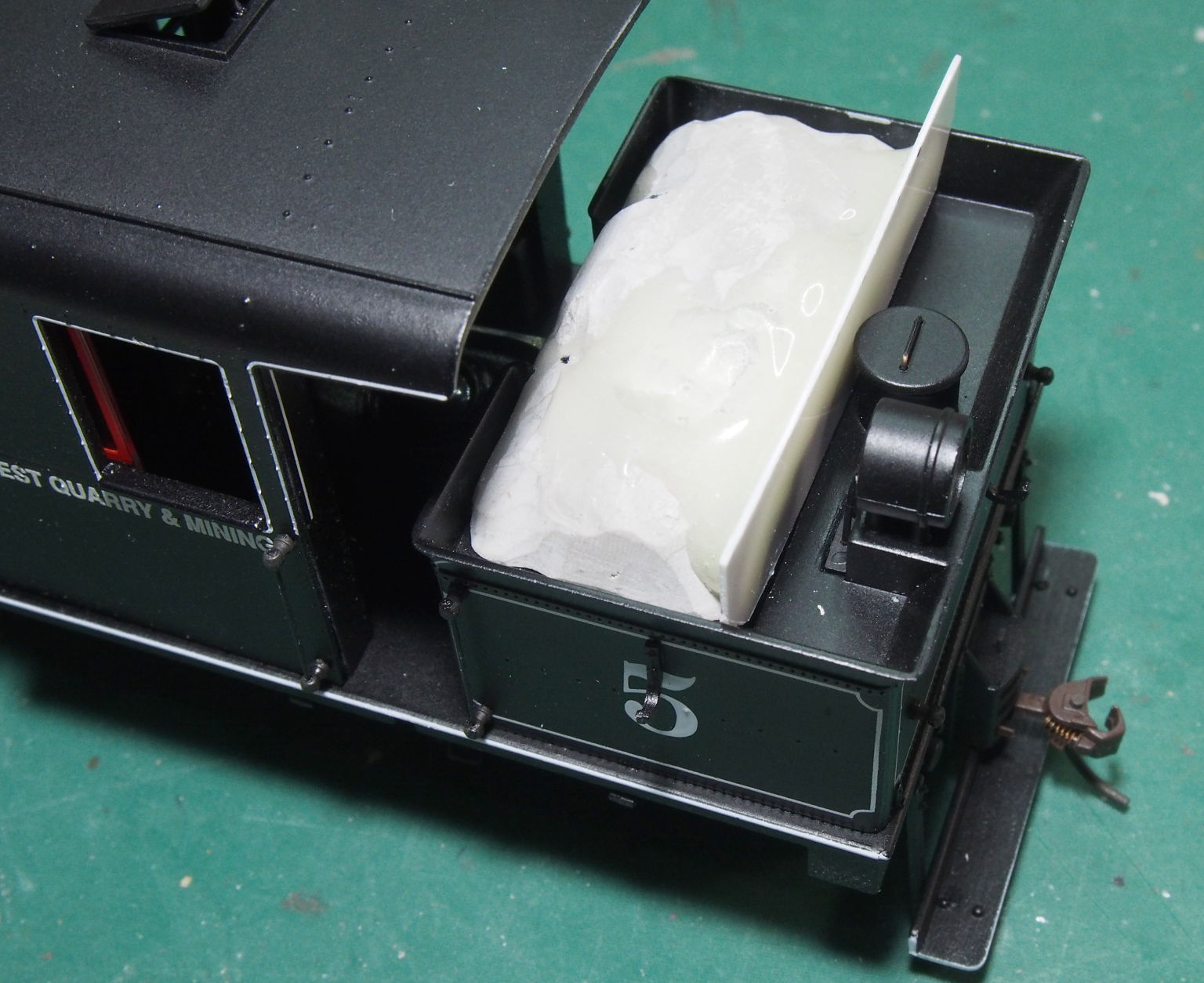 Shayと同じ付属の薪を乗せればそれでOKだが、このロコは石炭積みにしたかったので、エポキシ粘土でまずカバーを作る.