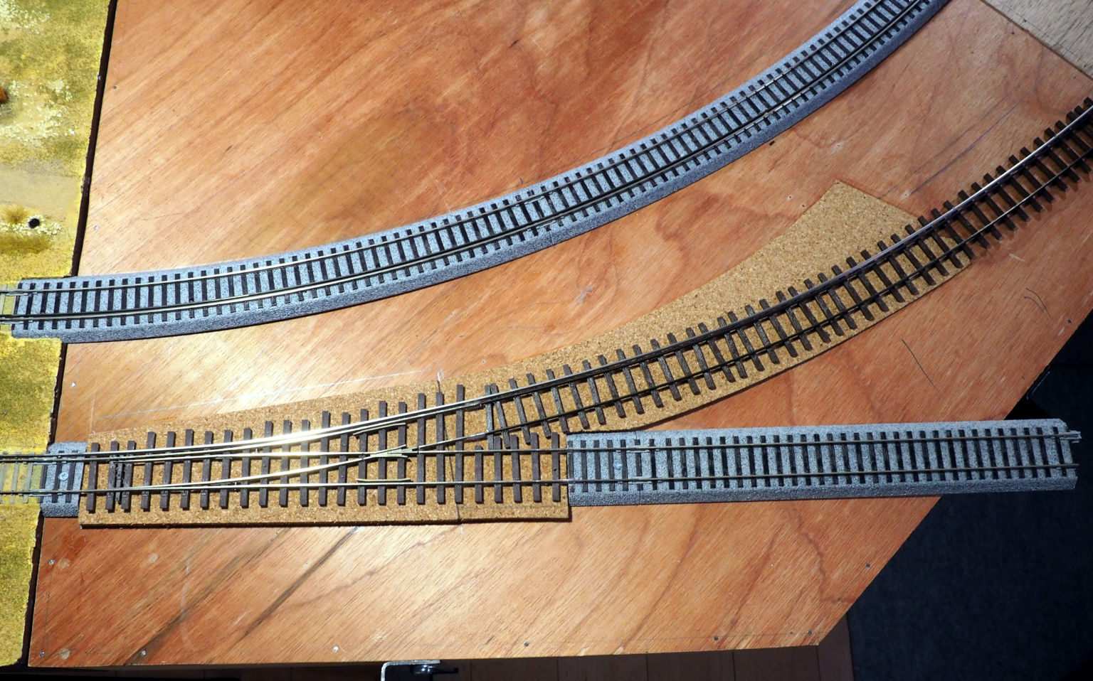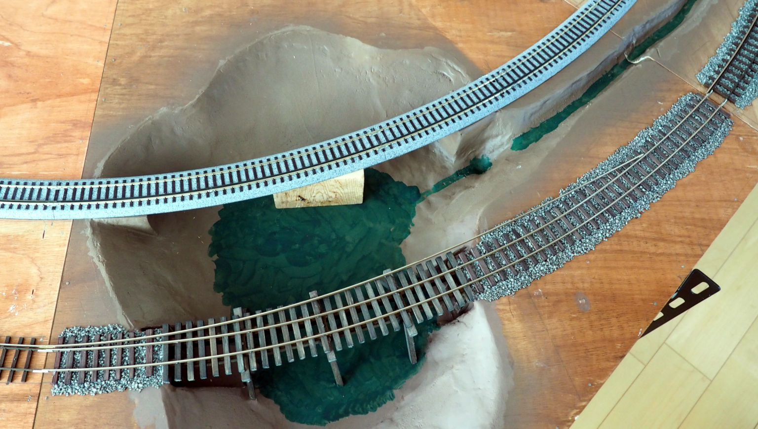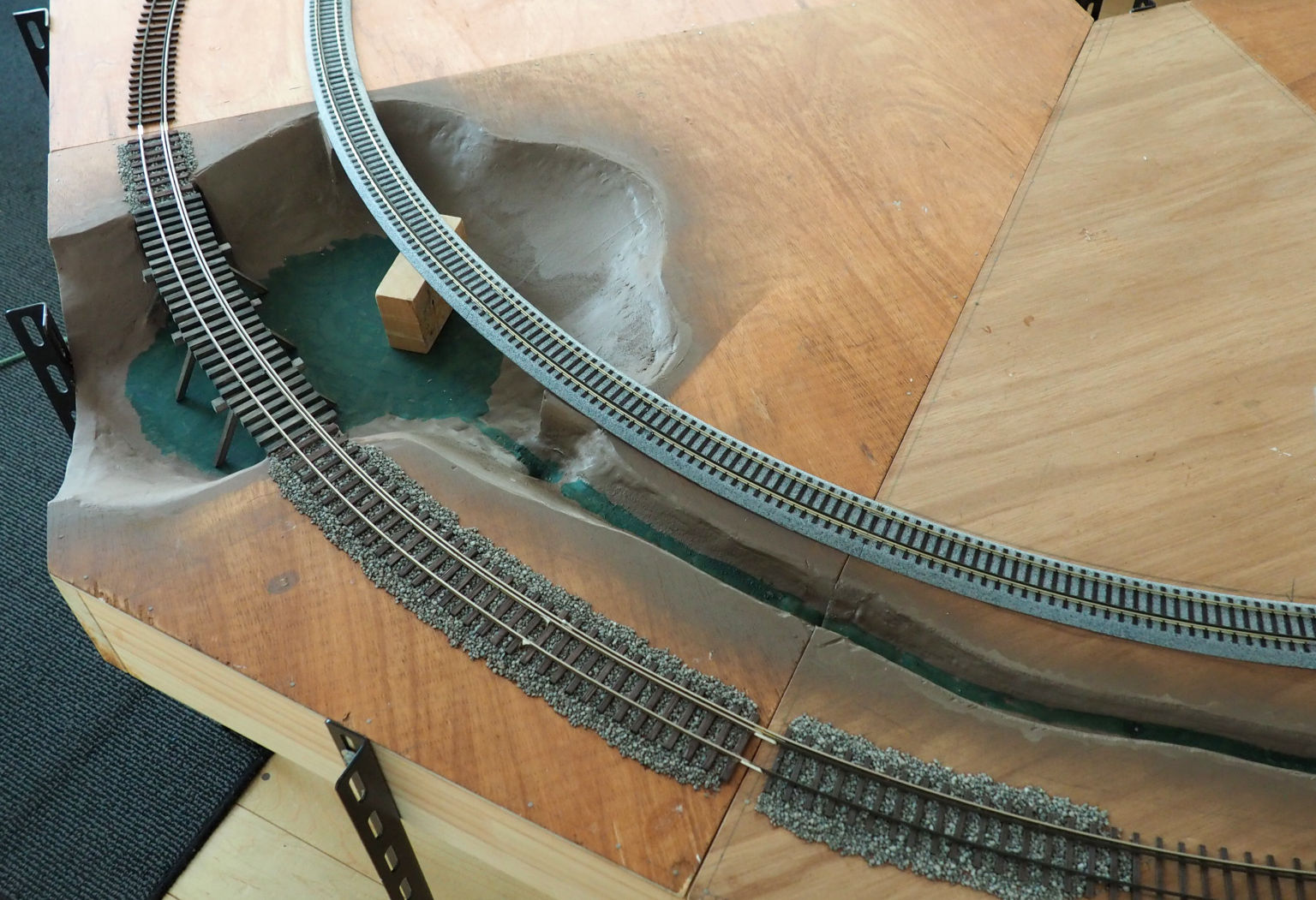 On30に On3(19mm)用のレールを追加する 右のユニトラックが、Sn3/On30 デュアルゲージ線路 (ここの橋はこれから考える) 左が、On3/On30 の線路 試験走行 On3の機関車は大きい 橋が小さく見える On30のみの分岐線 反対側の分岐線 ここはOn30の線路が足りず、 HO用のフレキシブル線路を使っている これで、とりあえず全線開通
