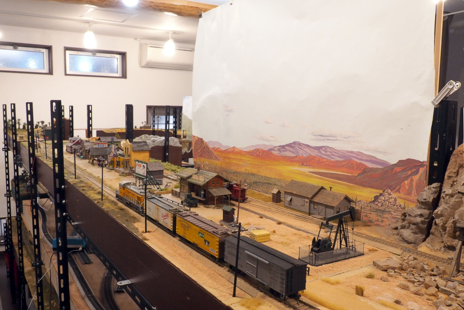 HOのモジュールに、背景画を置いてみた WALTHERSの「INSTANT HORIZON」という製品 大きさは 60 × 90cm 内容は色々あるが、これはサボテンの原野 ここだけ見ると いい雰囲気になる ここは貨物駅の裏にナローの線路があるので 背景画を設置すると、 裏側(写真右側)からの景色が見通せなくなる
