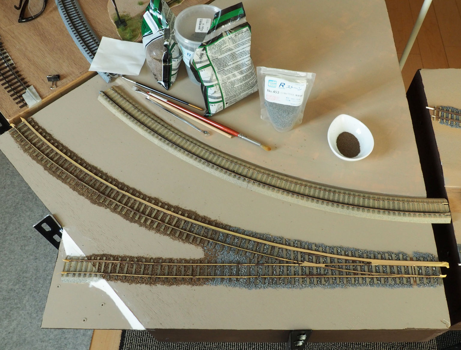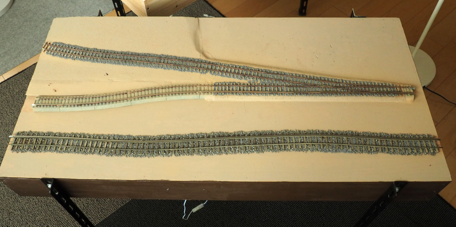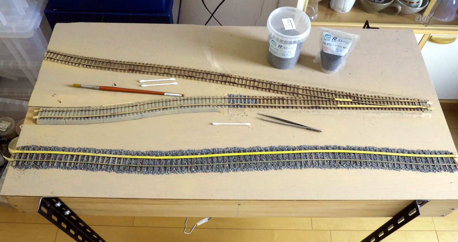 スチレン板、紙ねんど、ペーストで 地面の高低を補正する 台枠上面をアクリル絵具(カーキタン色)で筆塗り レールにマスキングテープを貼り、 側面をサビ色に塗る フレキシブル線路にはバラストを撒く 台枠側面を茶色(アースブラウン)に塗る これで地面の基礎は完成 分岐線のモジュール ユニトラックはベージュ色で軽く吹付塗装 レール側面のサビ色はフラットブラウン 場所によってバラストの色を変えている