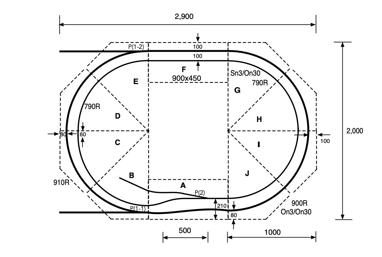 これらのモジュールは、元々On3とSn3のテスト走行のために計画したレイアウトで、外周のOn3と内周のSn3には、1/48と1/64というスケールの違いがある.