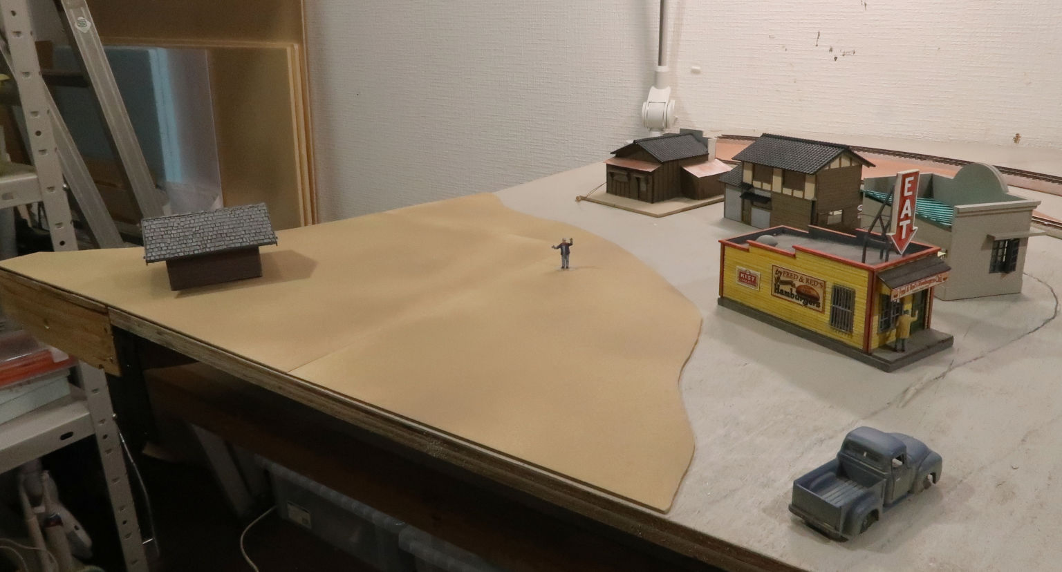 曲線モジュールの内側を切り抜いて「沼」を作る. 上部の小さい切抜きは稲荷神社の「池」 町の後ろに沼がある・・ どうも気に入らない. プラ板でフタをして農地にする 人工芝のマットにハサミで筋を入れる. 硬くてたいへん. なんの畑? 「さとうきび」かな 草パウダーを撒く. 北海道みたいな雰囲気になった. 広い農地の中にできた町?