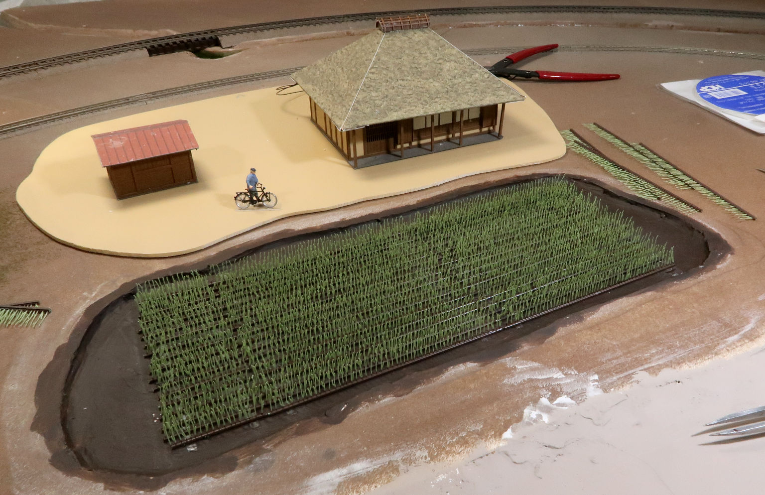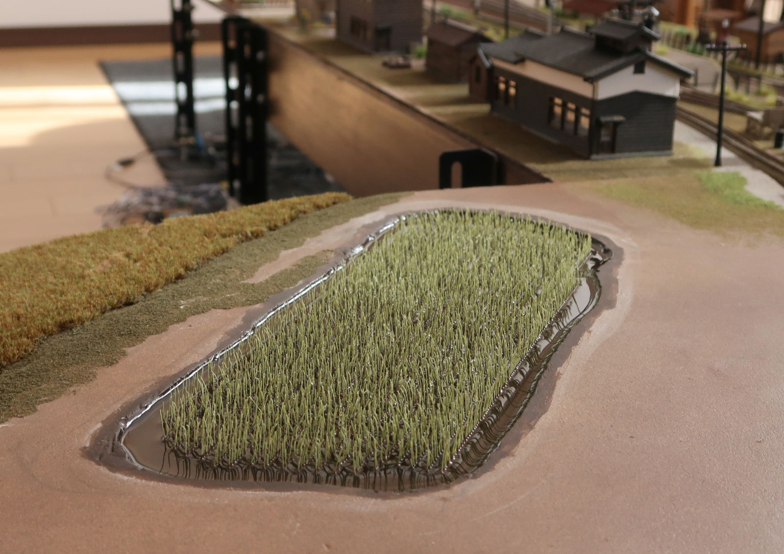 農家裏の土地を削って ここを田んぼにする BUSCHの「麦」の根元を着色する 「田植え」 一見よさそうに見えるが 真上から見るとヘン ピンセットで、茎を一本づつねじる エポキシ水を流し込んで、完成