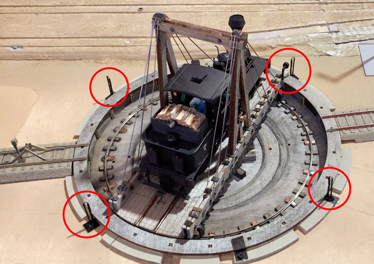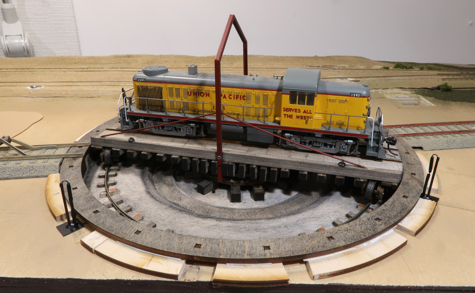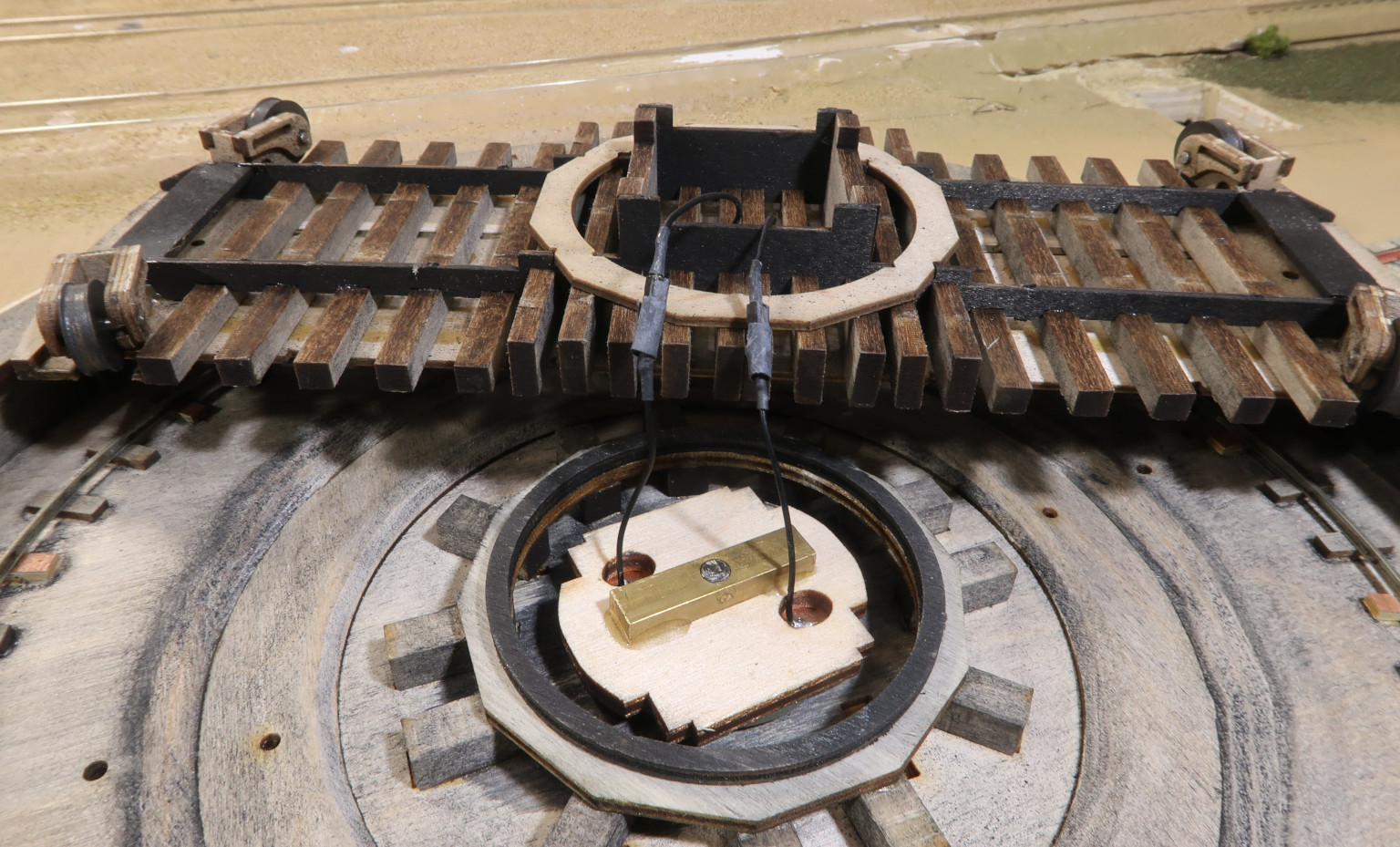 こぶりなターンテーブルだが、このモジュール上では少々大きすぎで、当初設置した分岐線路は廃止して、方向転換のみの一線とした.