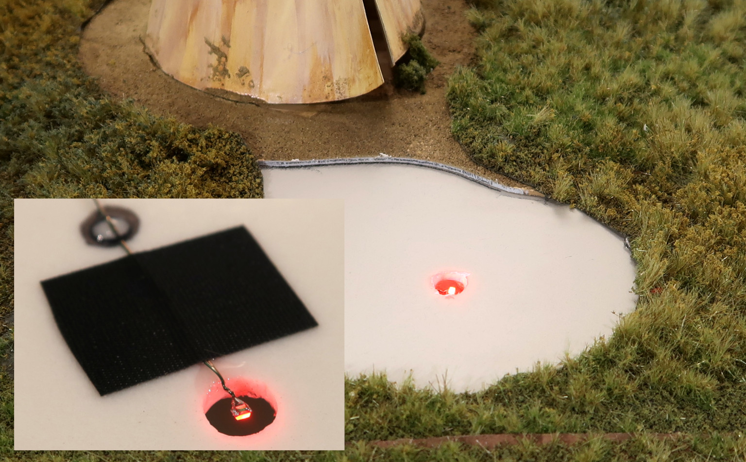 赤色チップLEDを地表のプラ板の下に取り付けて、