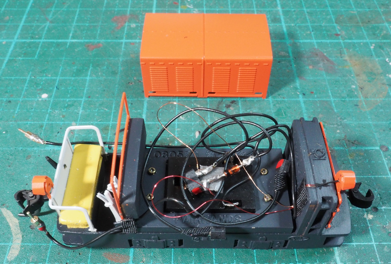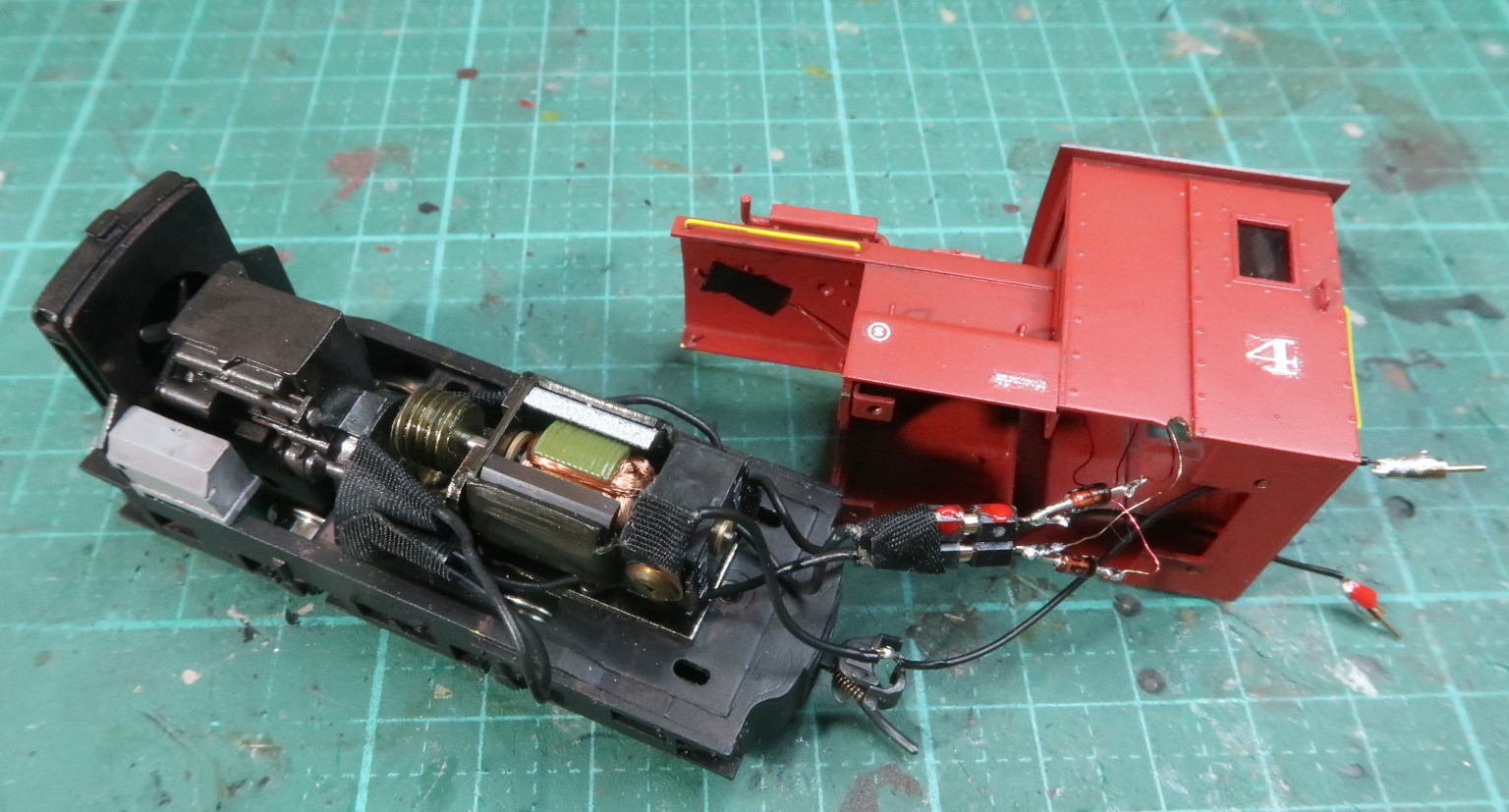 ・ライトの配線をCRDを介して集電車輪につなぎ、モーターの配線は車体後部から外に出してバッテリー車につなぐ.