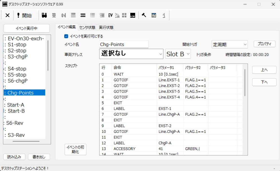Aslotに左回りの列車、Bslotに右回りの列車のアドレスをセットし、駅に進入するところからスタートする.