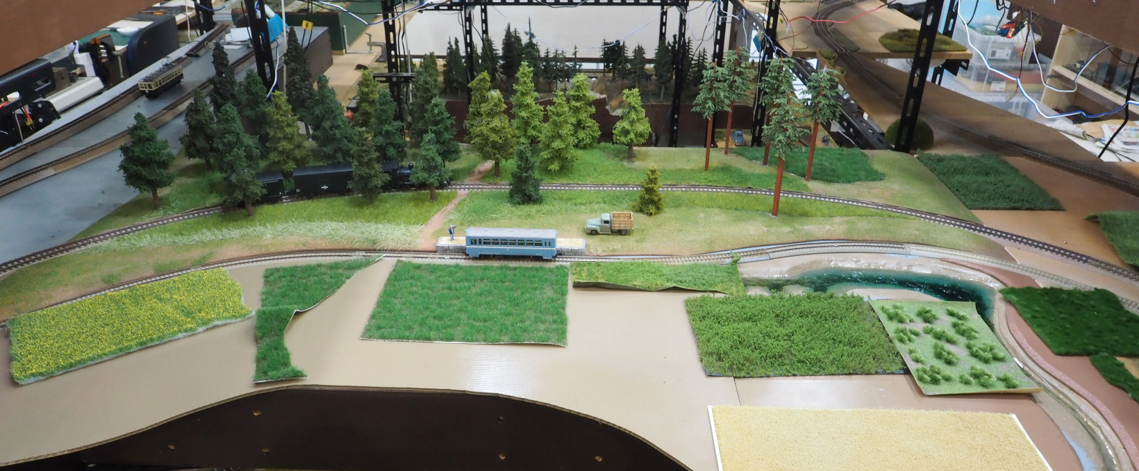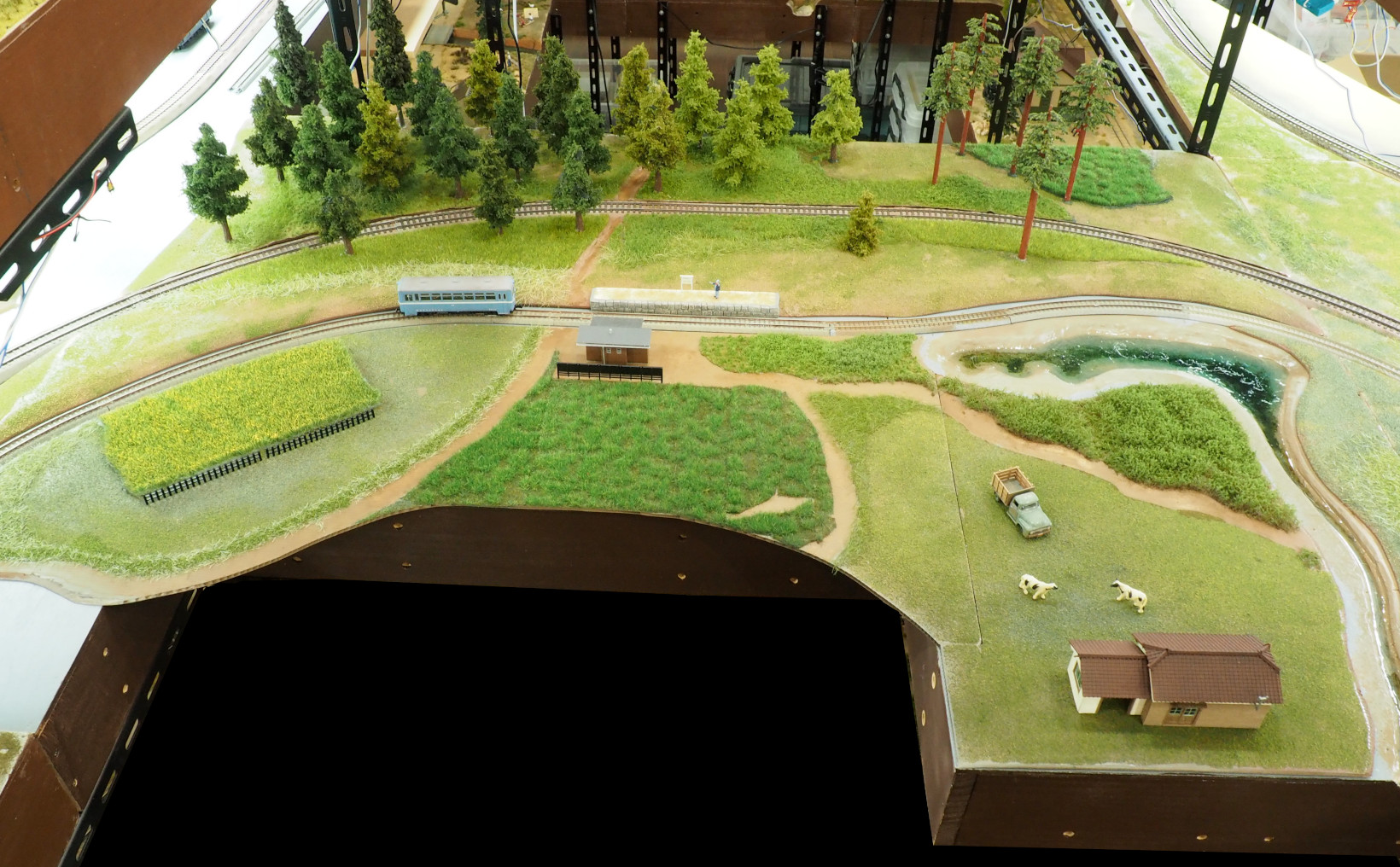 樹木ばかりだと列車がみえなくなるので、手前を野原にしたが、日本の田舎というより「北海道風草原」になってしまった.