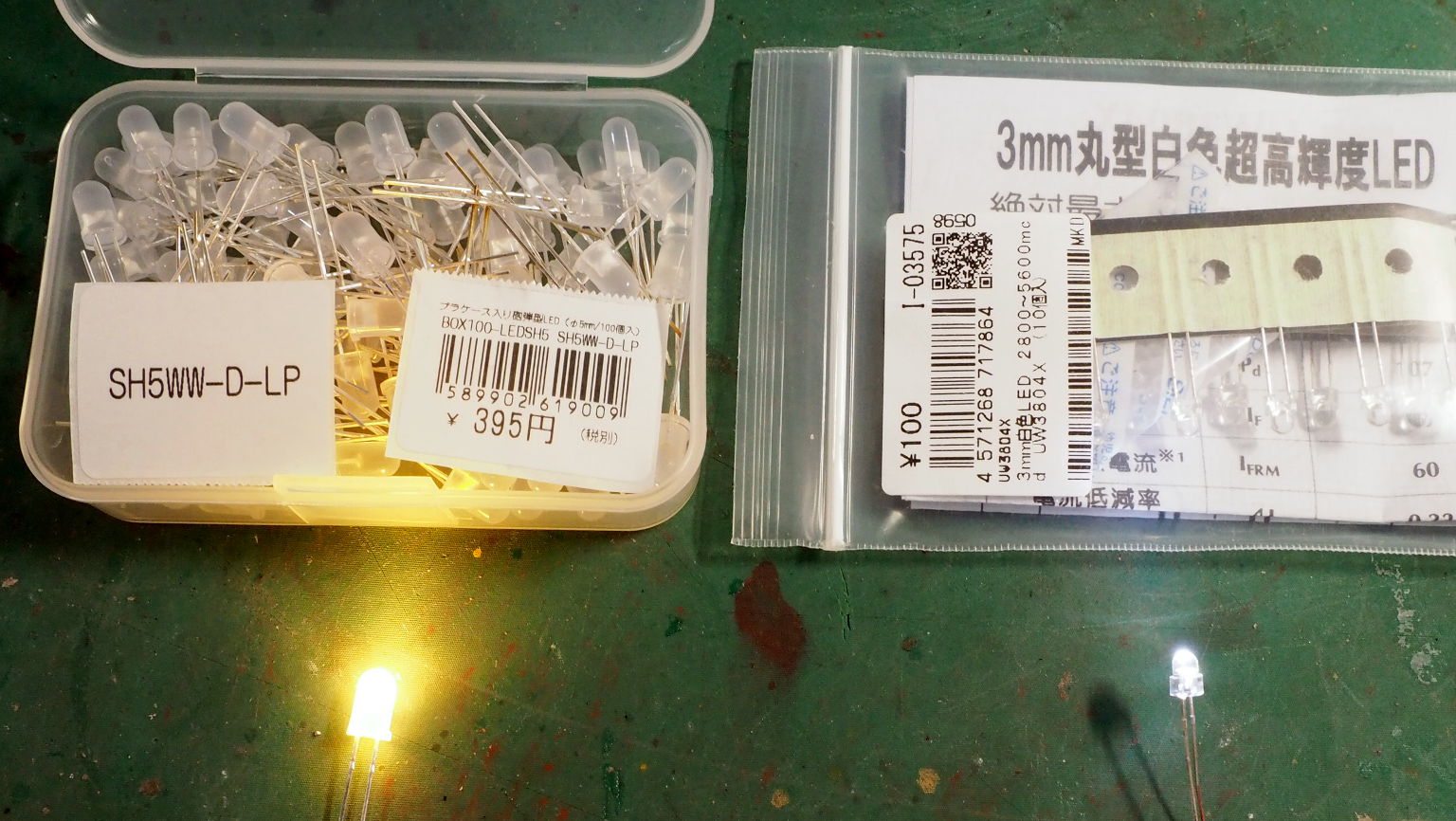 右は3mm丸型の白色LEDで、10個100円.