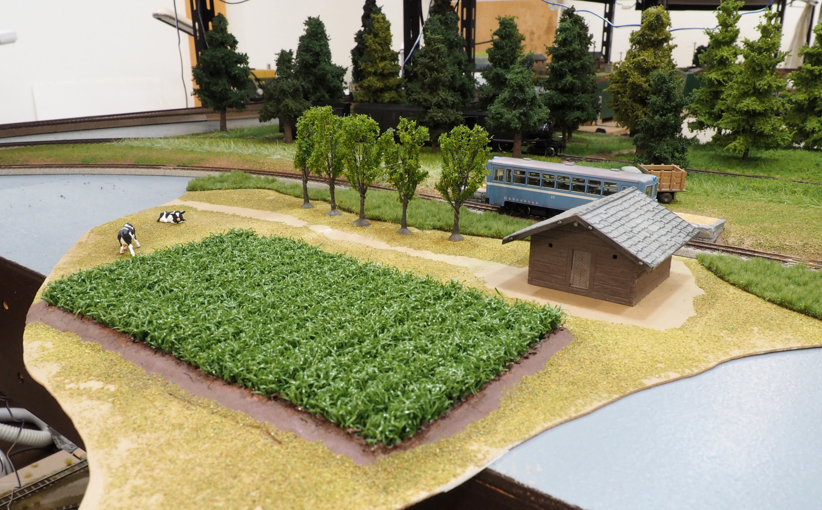 樹木ばかりだと列車がみえなくなるので、手前を野原にしたが、日本の田舎というより「北海道風草原」になってしまった.
